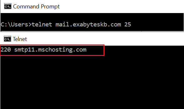 Start -> run -> type CMD -> In the command prompt environment type "telnet mail.yourdomainname 25"