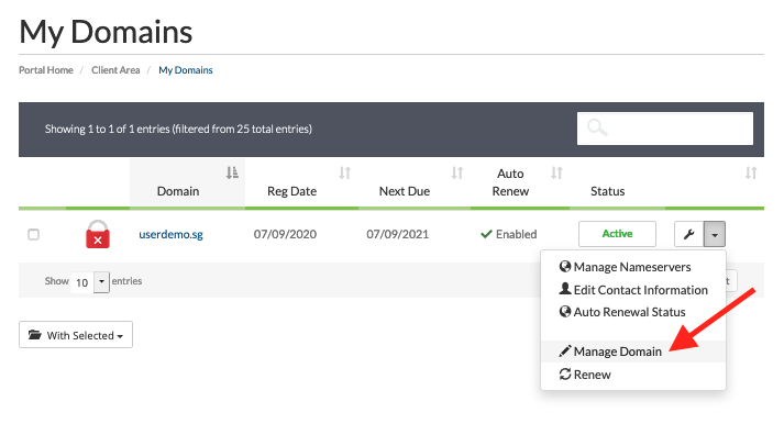 3. Search for your respective domain name, and click into the Tools icon at the right side. You will see "Manage Domain" as below and click into it.