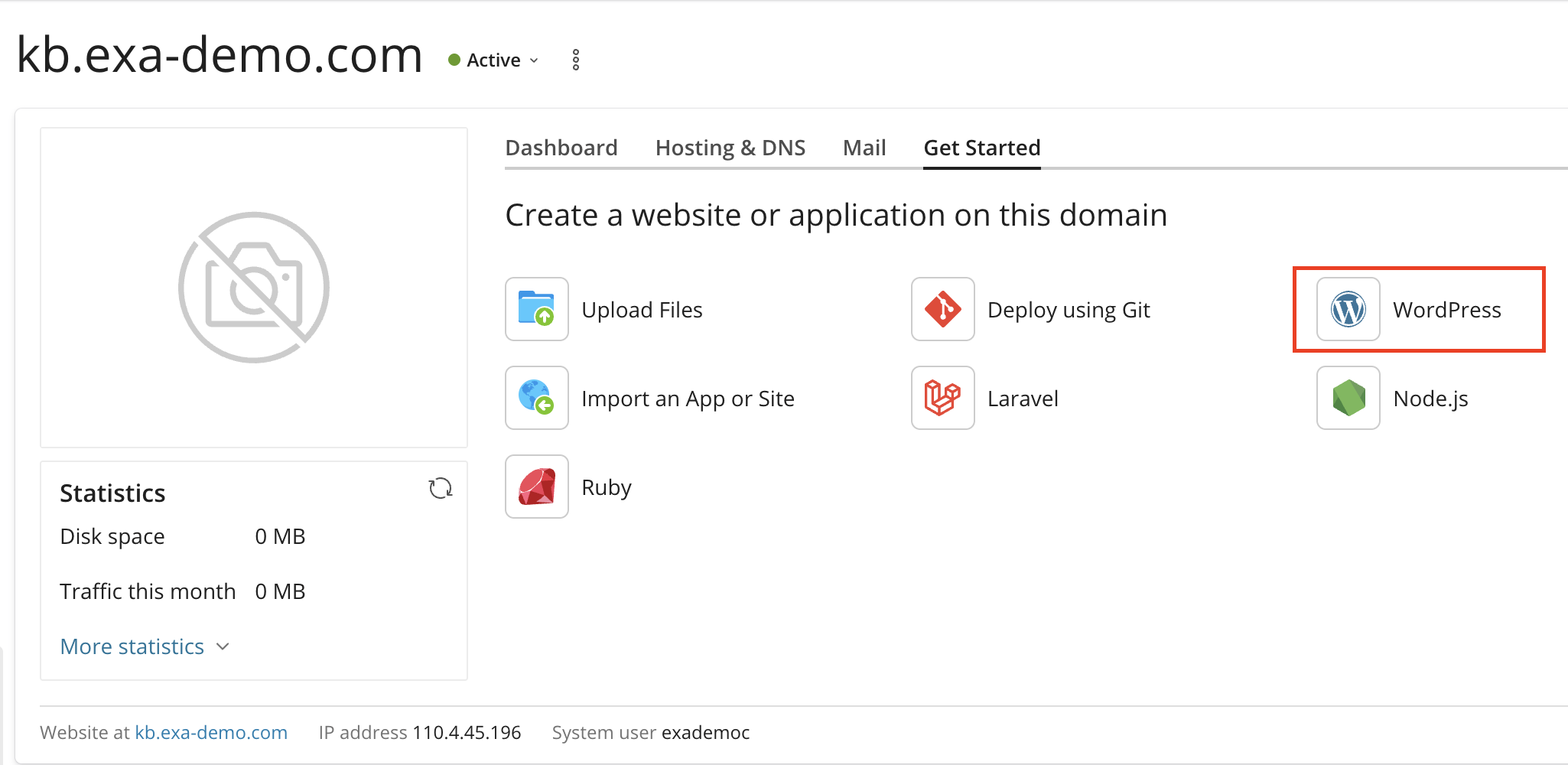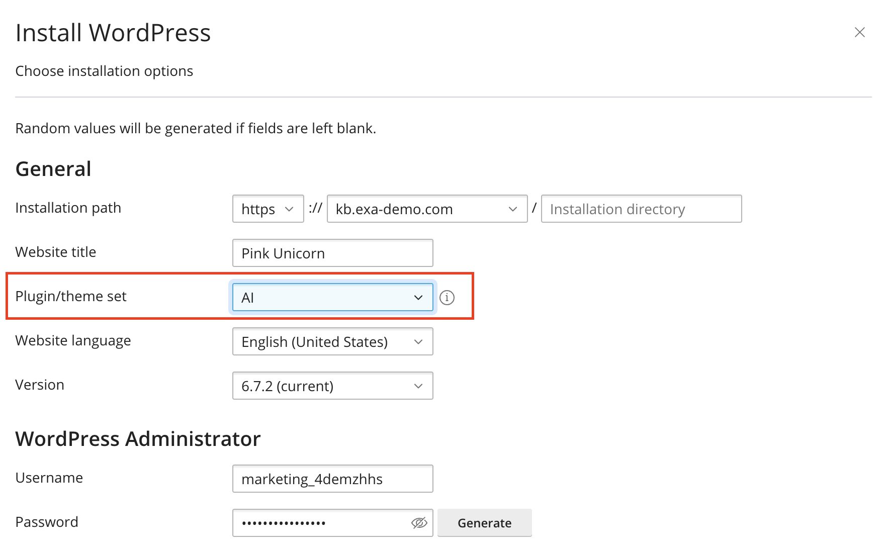 3. A prompt for the WordPress installation will appear, and make sure to select "AI" from the drop-down menu for the Plugin/Theme set.