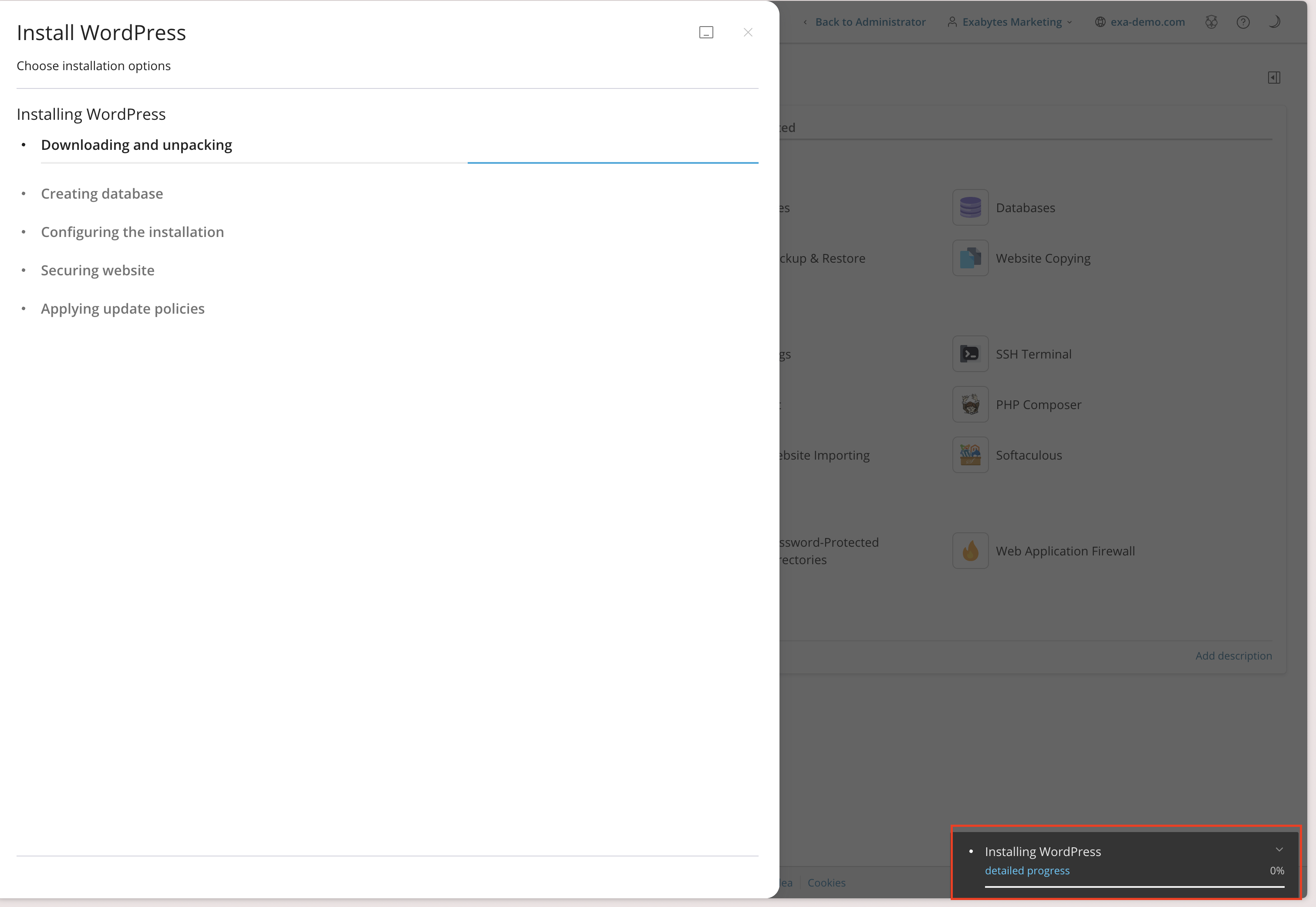 4. Core WordPress will be installed, with a prompt visible in the bottom right corner, followed by the AI set