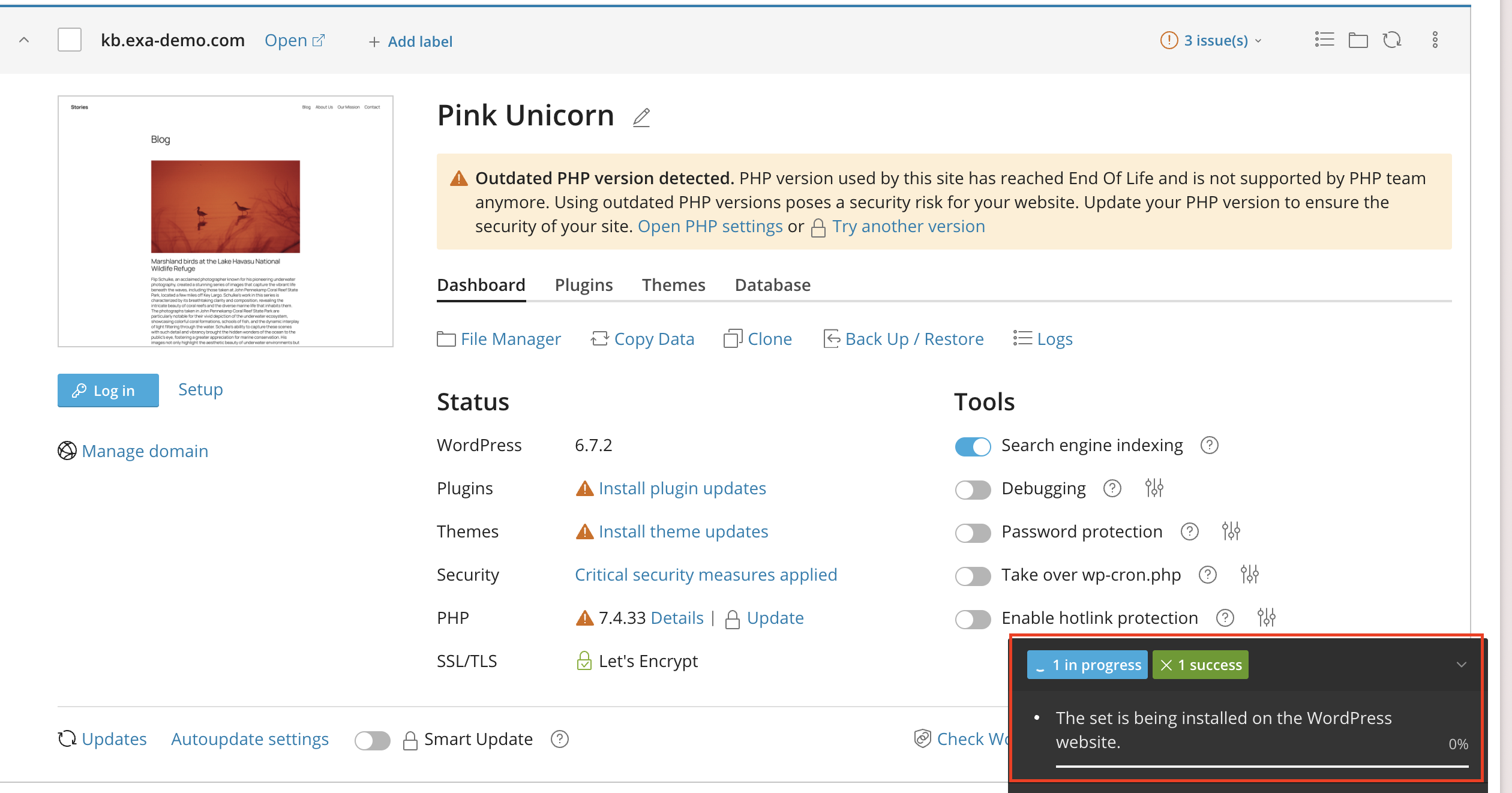 Note: Please allow some time for the plugin and theme set to finish installing.
