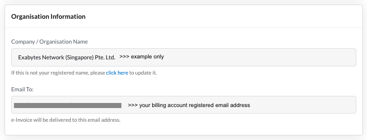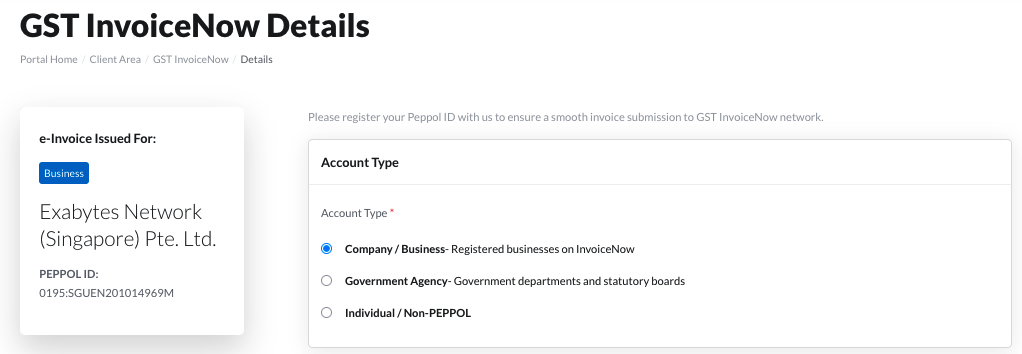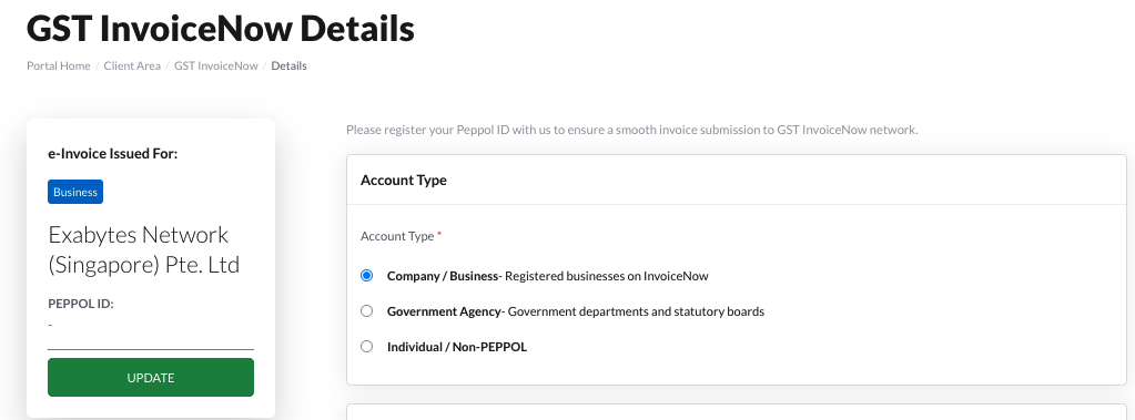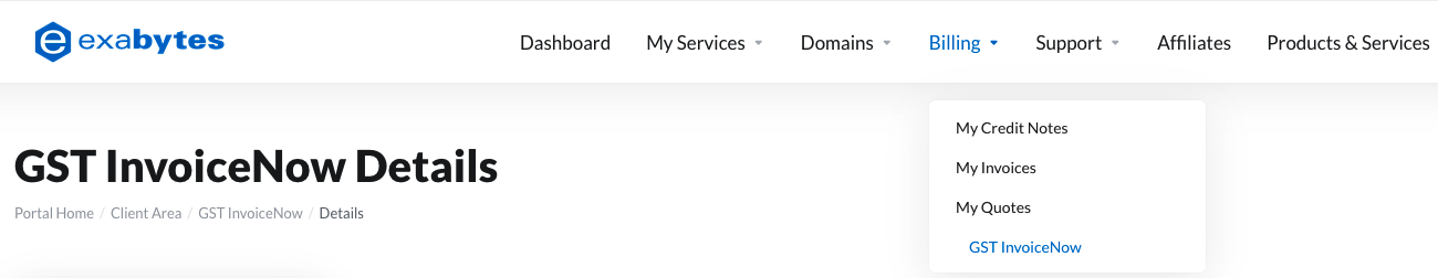 In line with Singapore’s nationwide InvoiceNow initiative, Exabytes Network (Singapore) Pte Ltd is onboarding the InvoiceNow e-invoicing network. To ensure seamless invoice delivery and compliance, customers are required to update their invoicing details in the billing system.