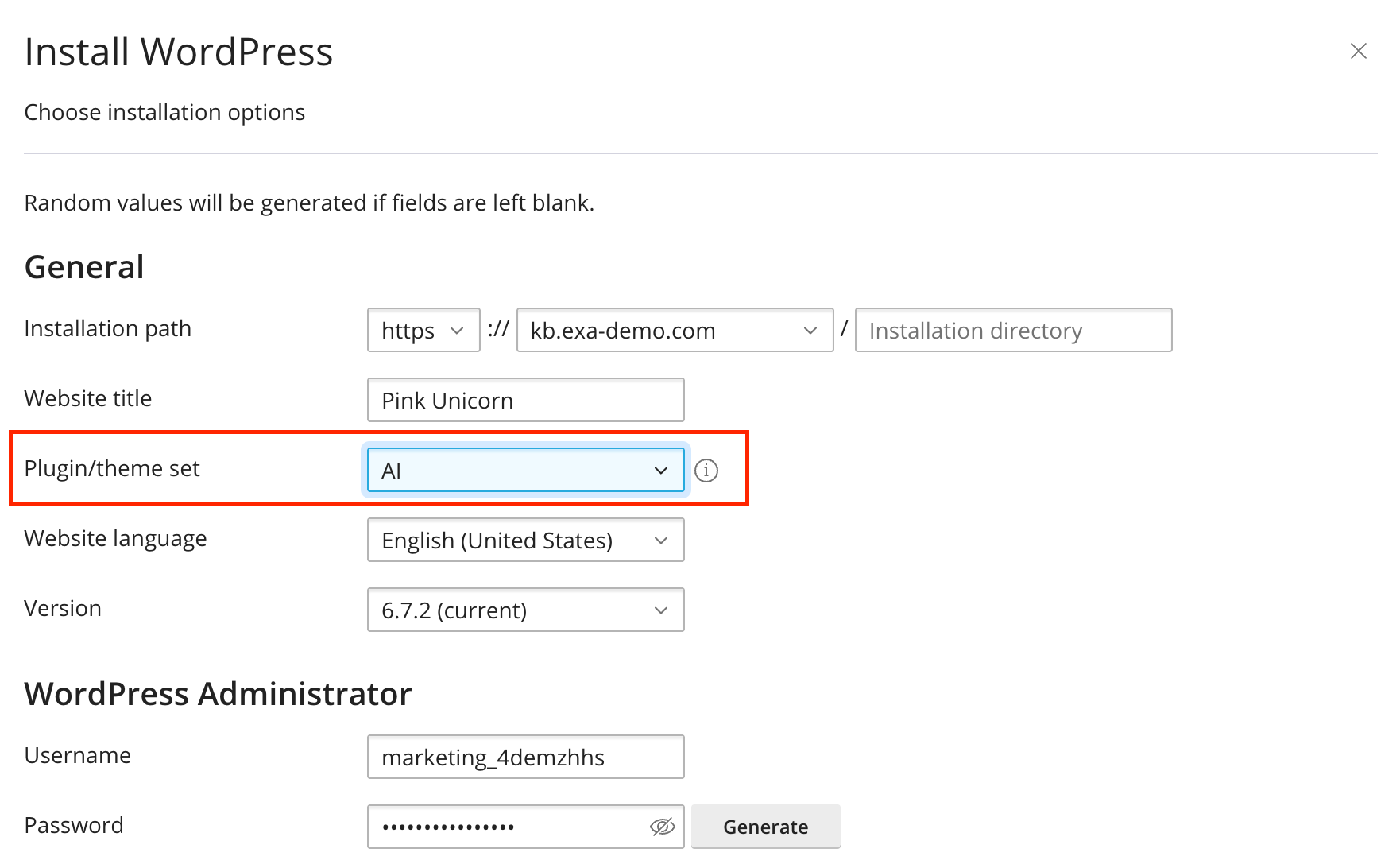 3. Prompt pada instalasi WordPress terlihat, dan pastikan untuk memilih "AI" ke menu tarik-turun pada set Plugin/Tema.